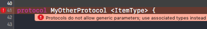The solution to the problem is suggested to you by Xcode. We can use associated types instead of a generic type parameter. Using this is very similar to a type parameter, we just need to provide a type when we implement the protocol. Let's see a small example: