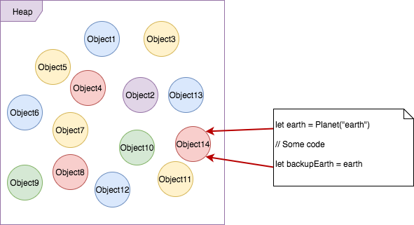 As seen on the diagram above, when we create a class on the heap, we can have multiple references to the same class. This means that we can change the state of the class from multiple places in our app. Let's go through a quick code example:class Planet: CustomDebugStringConvertible {