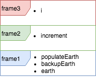 When we created a class, we pushed 'frame1' on the stack with all the instance variables that the class has (the class itself is on the heap). When we called the function 'populateEarth', we pushed 'frame2' on the stack. Within that function is a for loop, that's another frame. When the loop finishes, 'frame3' will be popped off the stack and all its variables will be destroyed. Same goes for all other frames.