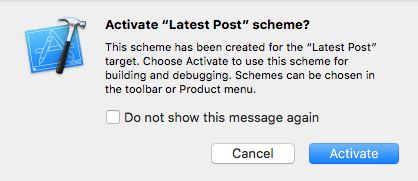 When you click 'Finish' Xcode will prompt you to activate the scheme for your new target, go ahead and activate it: