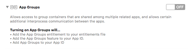 We have to enable app groups for our main target and the extension target. Select your main target and select the 'Capabilities' tab. Find 'App Group' and flick the switch to enable it: