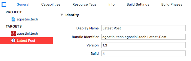 Before moving on, select your target, open the 'General' tab and make sure that the version and build number match your main target, otherwise you won't be able to submit the app: