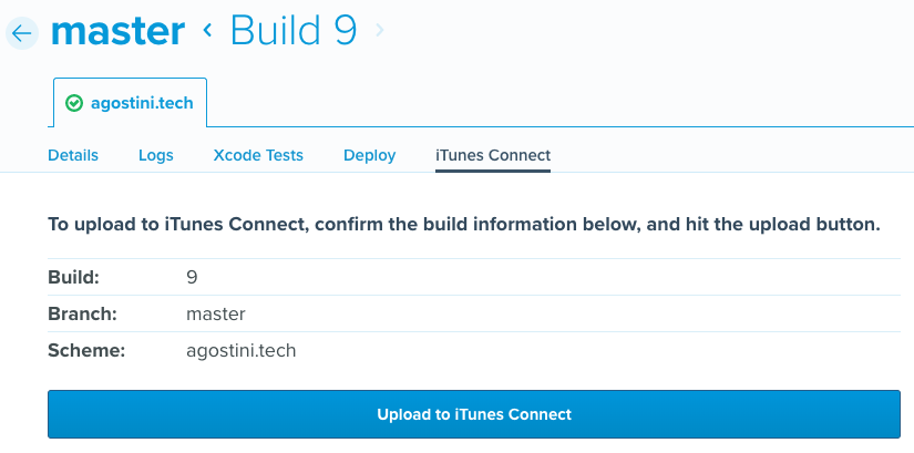 You can even have your rules set to prevent the pull request from being merged unless all the checks have passed. I highly recommend this approach, especially for the master branch. And, of course, as soon as you merge your pull request your build will kick off again. Now you wait until your build magically appears on your iTunes Connect. You can upload the build manually if you want by selecting the latest build from the master and going to 'iTunes Connect' tab: