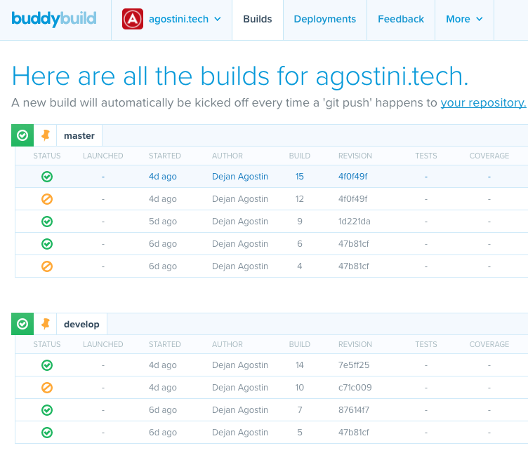 Just building a project isn't all that useful (apart from a sanity check), the real power lays in running the tests and automatic deployment. Let's cover the tests first. Each branch will have a little cogwheel on the right side, if you select it, you can configure this branch. For example, configuration for my master branch looks something like this: