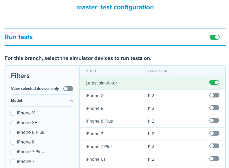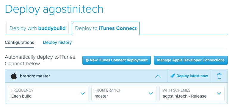 I'm deploying from my master branch, so I want the deployments for each build and I want it built with the release scheme. One small detail to note here is, you will have to go to your master branch configuration and enable 'build for archive':