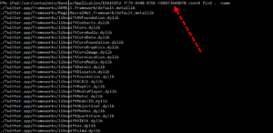 Let’s look at the Twitter iOS app. Let’s go inside the Twitter directory. Once you are inside the folder, use the Find -name *Frame Unix command to displays specified parts of object files and the libraries.