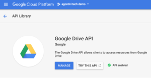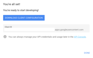 When you create your new project, your Google Drive API should be enabled by default and you should be presented with a screen similar to this one: