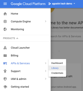 In case this didn't happen for you, you can always enable the Google Drive manually. Select the menu icon in the top left, select 'API & Services' and 'Library' from it: