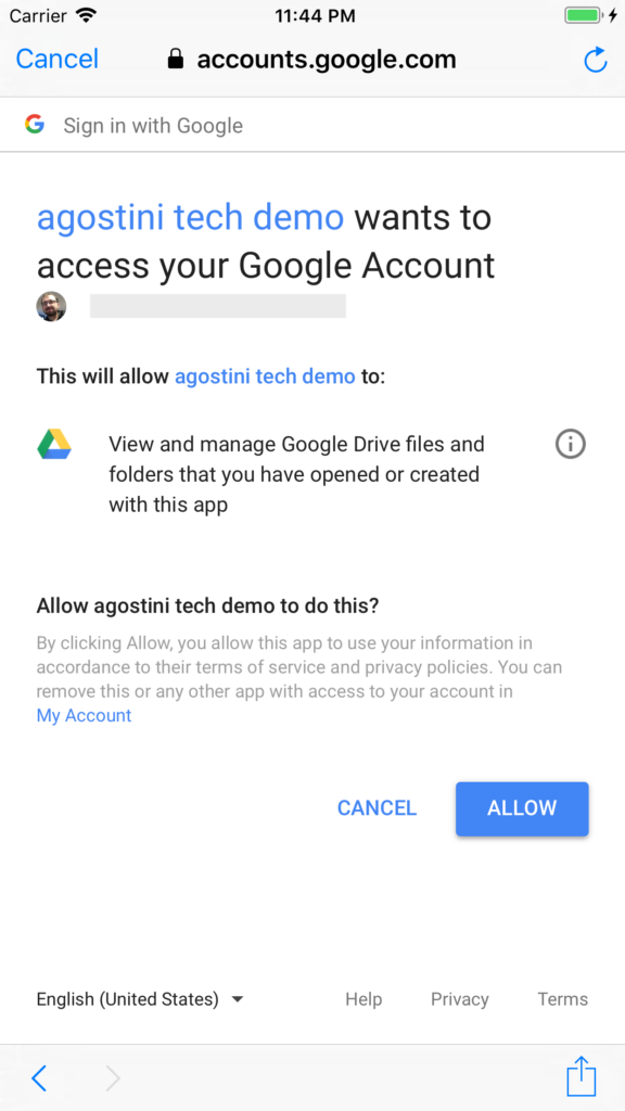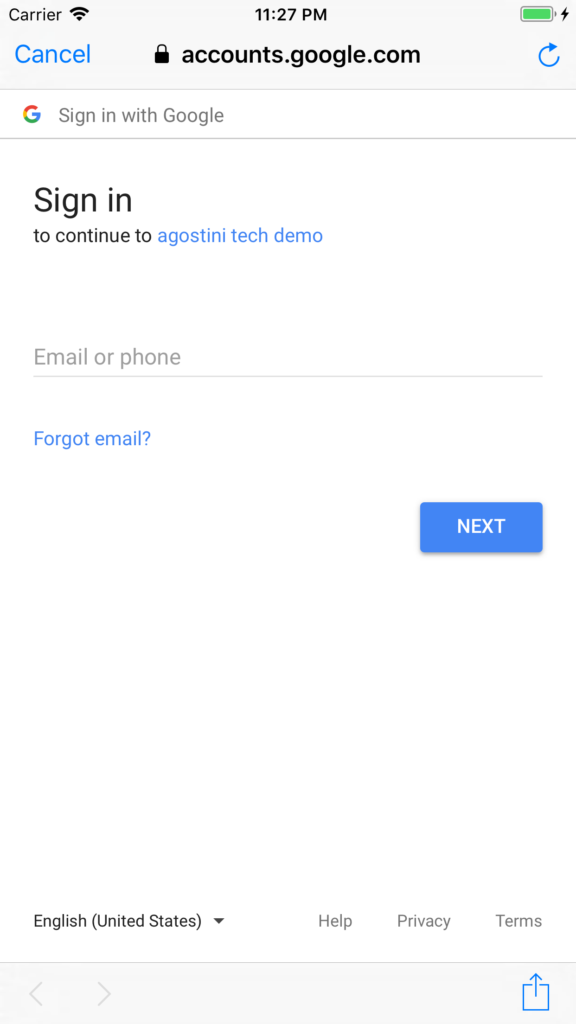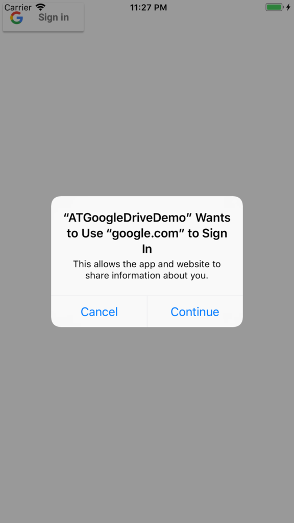 This is just a demo app, and like all our demo apps, the UI is pretty elemental :) We'll have a Google Sign In button on the UI. Once you tap it, you will be redirected to the Google Sign In page, the app will ask for permissions to use google.com to sign in, go ahead and tap 'Continue':
