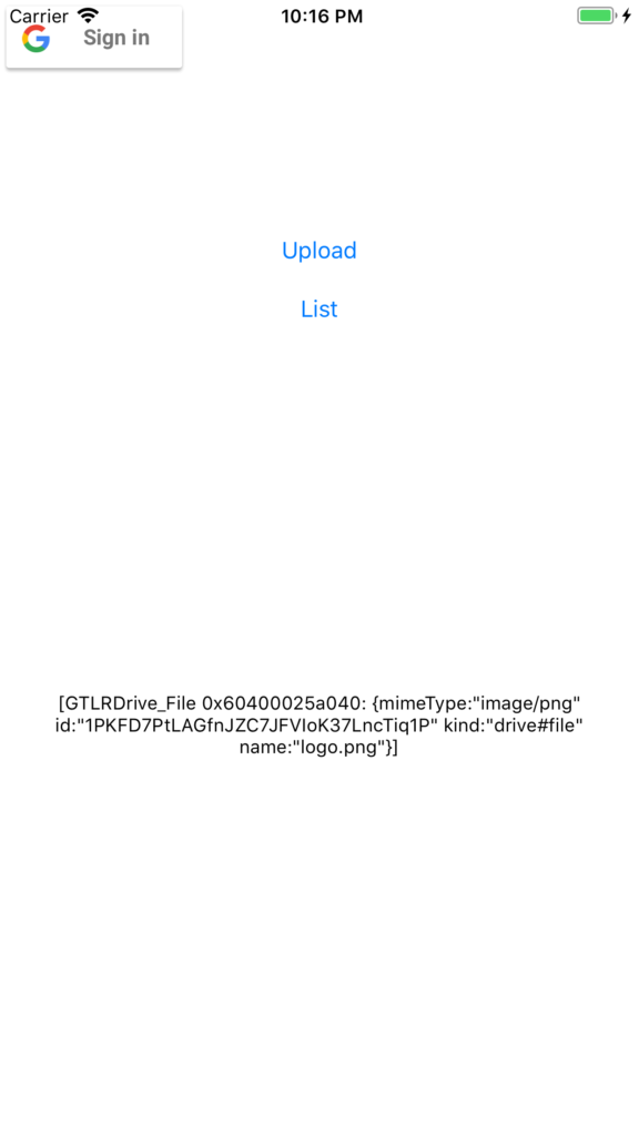 Tapping the 'Upload' button will upload the above image to Google Drive. If we tap on the 'List' button next, we'll see the content of the folder listed on the screen.