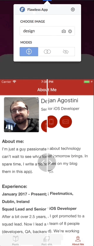 Most developers are a bit OCD, but designers can be OCD too. I worked on projects where designers demanded absolute perfection, every single UI element had to be just right. They drove the developers crazy. We actually had to resort to tricks like having the design of the screen as a background image with an alpha, and having the UI overlaid on top of it. As soon as I saw Flawless App, I remembered this. Flawless App is brilliant in its simplicity. It's just a simple macOS app that sits in your menu bar. You use it to load up your design files, and it will overlay this design over your simulator. It's really simple to use, and it certainly doesn't require you to modify your code in order to compare your implementation to the original design.Features