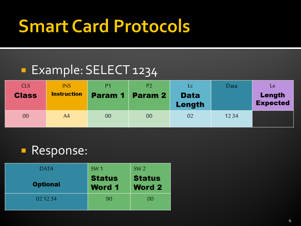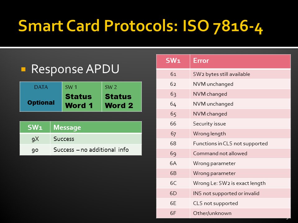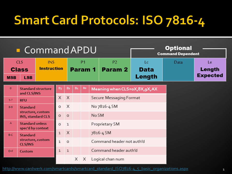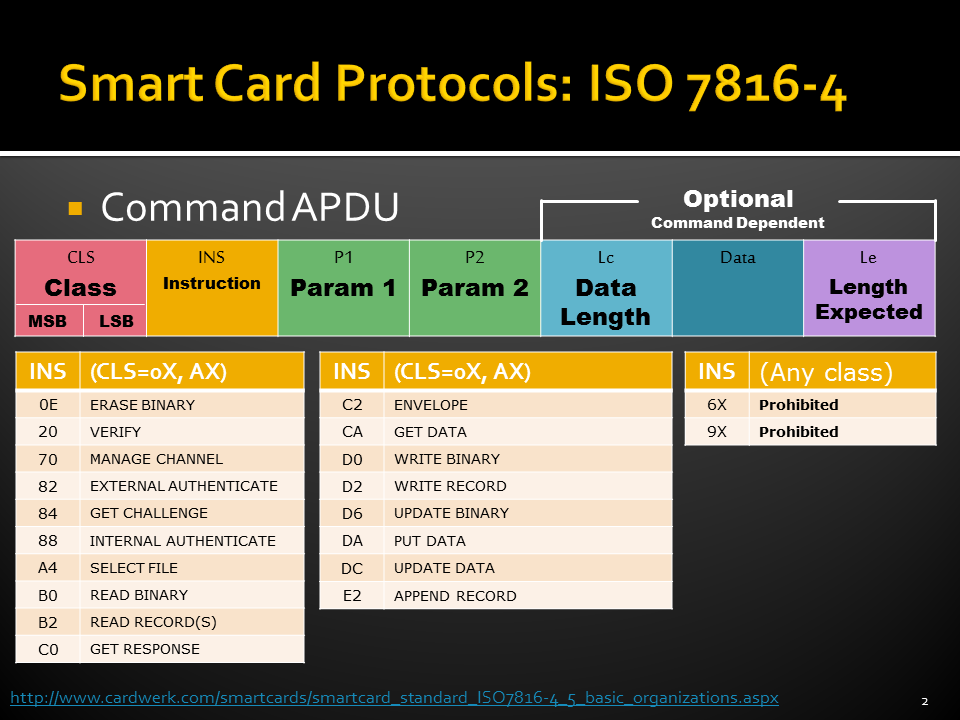 - ISO 7816-4: Standard commands, Application Protocol Data Units (APDUs),