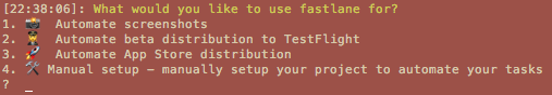 fastlane will ask you a couple of simple questions, just follow the wizard. We'll be automating the app store distribution, so select that option when you see these options: