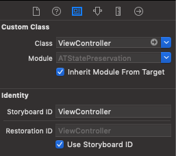 Next, you'll have to provide the restoration identifiers for every view controller on which you want to use state restoration. You don't have to use state restoration on all of your view controllers. If your view controller doesn't have the restoration identifier it will simply be skipped when the system tries to save/restore state. Open your storyboard and set the restoration identifier in the identity inspector: