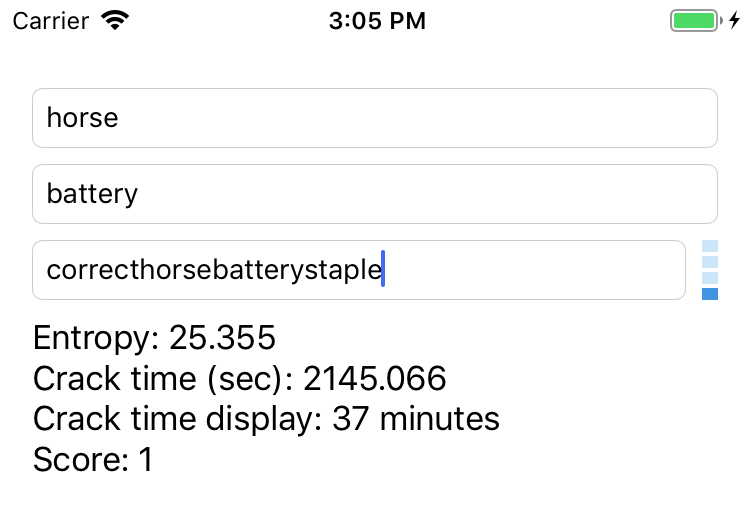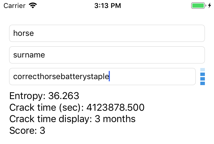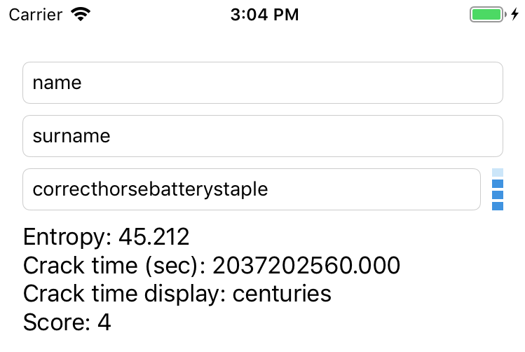 extension ViewController: UITextFieldDelegate { func textField(_ textField: UITextField, shouldChangeCharactersIn range: NSRange, replacementString string: String) -> Bool { if let password = (textField.text as NSString?)?.replacingCharacters(in: range, with: string) { // Update the meter view let userInputs = [firstNameTextField.text ?? "", lastNameTextField.text ?? ""] passwordStrenghtMeeterView.scorePassword(password, userInputs: userInputs) // Score the password let result = DBZxcvbn().passwordStrength(password, userInputs: userInputs) resultsLabel.text = "Entropy: \(result?.entropy ?? "")\n" + "Crack time (sec): \(result?.crackTime ?? "")\n" + "Crack time display: \(result?.crackTimeDisplay ?? "")\n" + "Score: \(result?.score ?? 0)\n" } return true }}