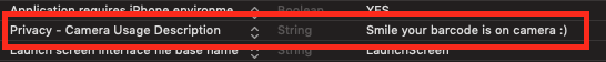 Before we jump into the code, go to your Info.plist file and add a value for a key 'NSCameraUsageDescription' otherwise you might be surprised :)