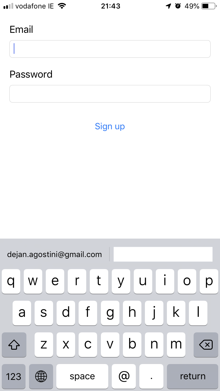 Now, let's build and run the app and go to our sign up view controller. As soon as we tap into the Email text field we should see the suggested emails: