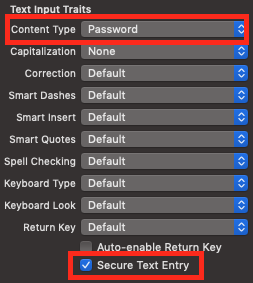 And we've set the keyboard type to email, just for convenience. For the password field we'll set the type to 'Password' and we'll select 'Secure Text Entry':