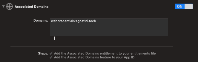 You need to associate your app with a domain that you own. This will be used to store data in the system keychain. It's a two-step process. First you need to enable the associated domains in your project capabilities tab: