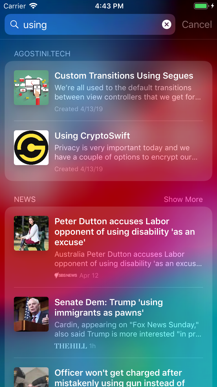 Now, if we build and run the project, and open a few articles, then if we search for one of the articles using spotlight this is what we'll get: